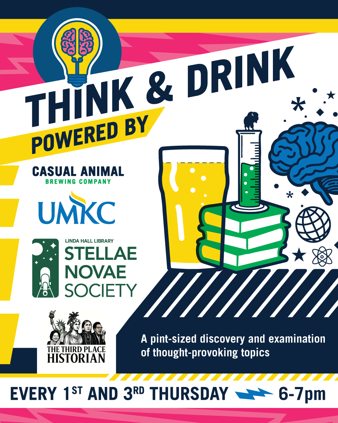 Our goal is to create a "third place" for the Kansas City community—an unplugged, in-person environment where curiosity is celebrated and attention is undivided. This ongoing lecture series delivers a wide array of topics that generate fresh perspectives, ideas, and discussion. These community-driven events are powered by a collaboration between UMKC, Linda Hall Library, The Third Place Historian, New Colossus Advisors, and Casual Animal Brewing Company.
